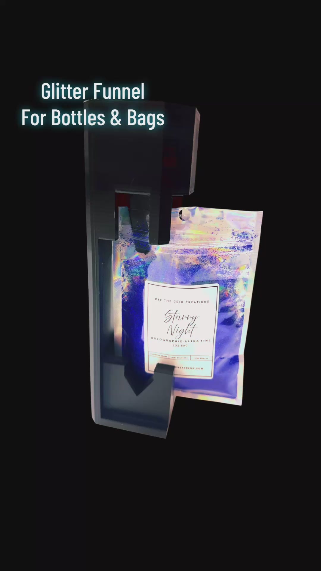 This 3D printed glitter funnel for bags is designed to make transferring loose glitter, mica powder, and fine craft materials into resealable bags and flat-bottom pouches easy and efficient.